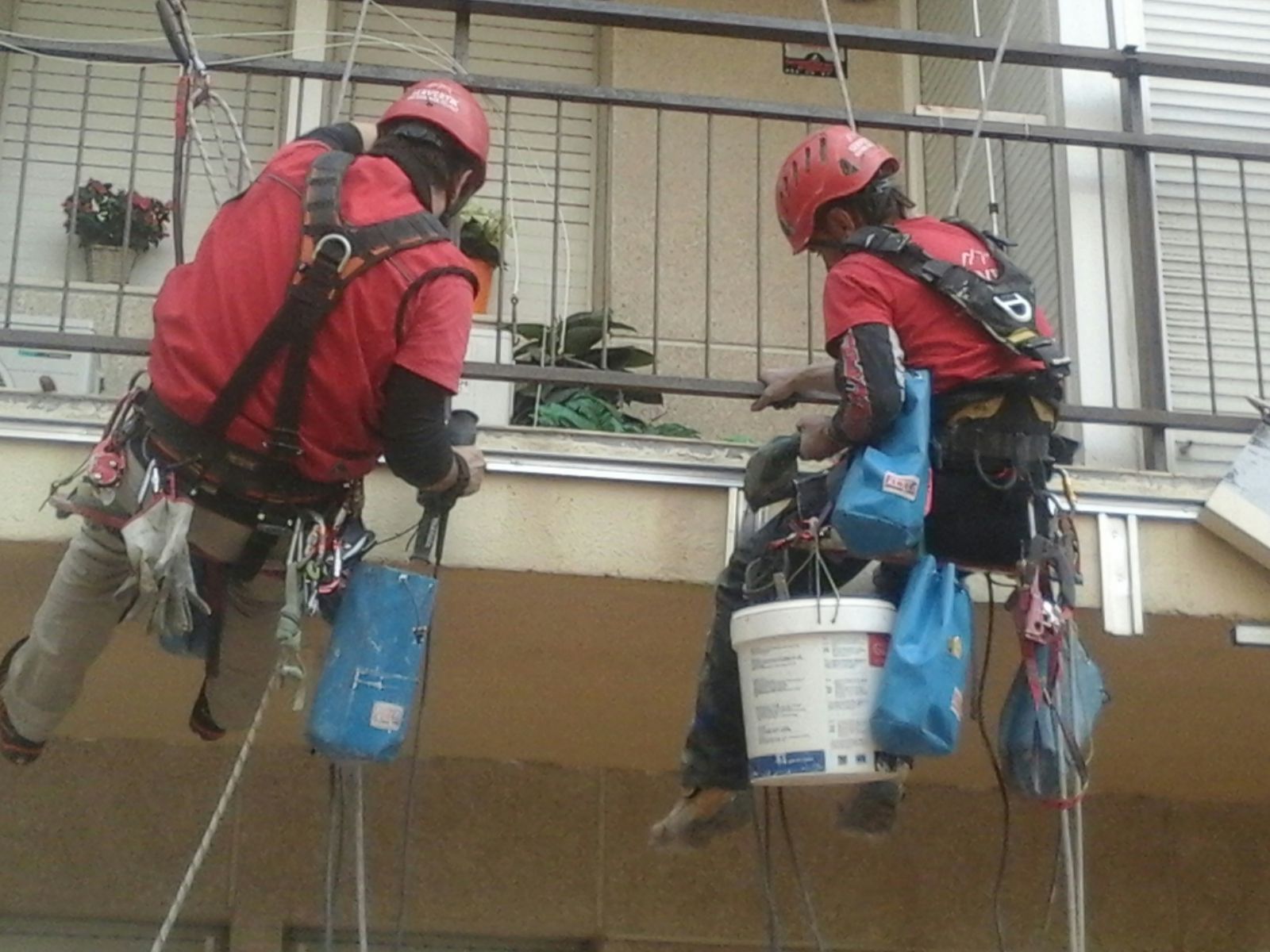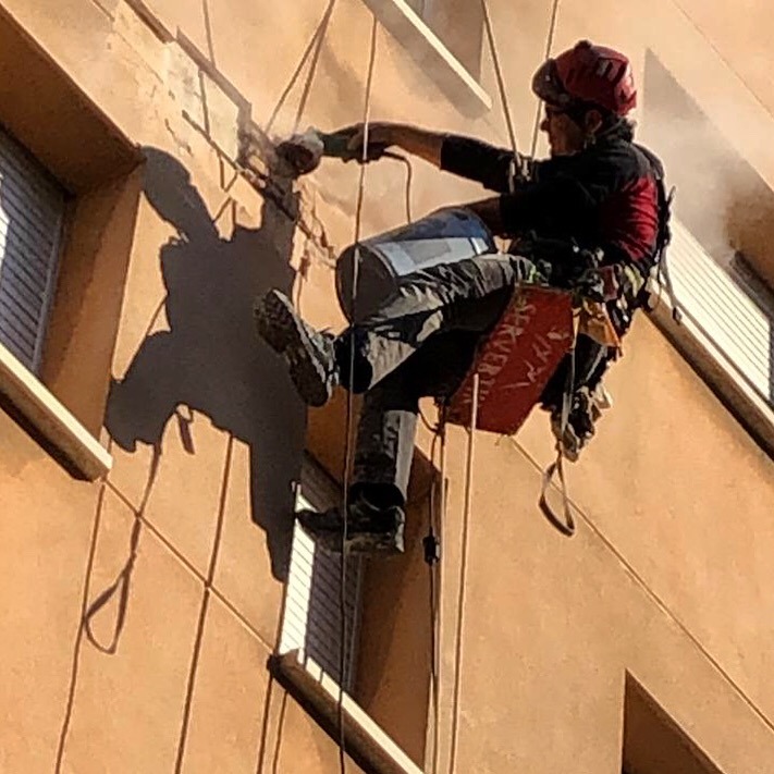 Fa pocs dies varem fer una reparació d’urgència a Santa Coloma. Es tractava d’una canal i una part de la façana que un camió grua havia malmès. A causa de les últimes pluges, començava a haver-hi infiltracions al pis afectat, a més a més hi havia el perill que caiguessin parts de la façana al carrer. Com que l’afectació era petita, era inviable col·locar bastides i amb treballs verticals es podia fer molt més ràpid i econòmic.